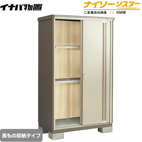 | 仕様・ 特徴 | 長もの収納タイプ 屋根タイプ:標準型 耐荷重タイプ:一般型 扉タイプ:2枚扉 間口1100mm×奥行き720mm×高さ1903mm 面積0.79m2(0.24坪) 本体重量約97kg 基礎ブロック必要数(別途必要):4個 付属品:アンカープレート・転倒防止金具・組立簡単工具・棚板 |