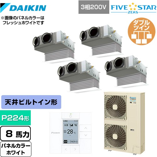 | 仕様・ 特徴 | 吹出口を自由に調整、スペースに合わせた快適空間を 天井埋込カセット形 ビルトインHiタイプ P224形 8馬力相当 ダブルツイン 三相200V ワイヤードリモコン 冷房能力:20.0(9.0~22.4)kW 暖房能力:22.4(10.1~28.0)kW 冷媒:R32 パッケージエアコン 抗菌・防カビフィルター 清潔アルミフィン ドレンアップメカ 冷媒チャージレス方式 |